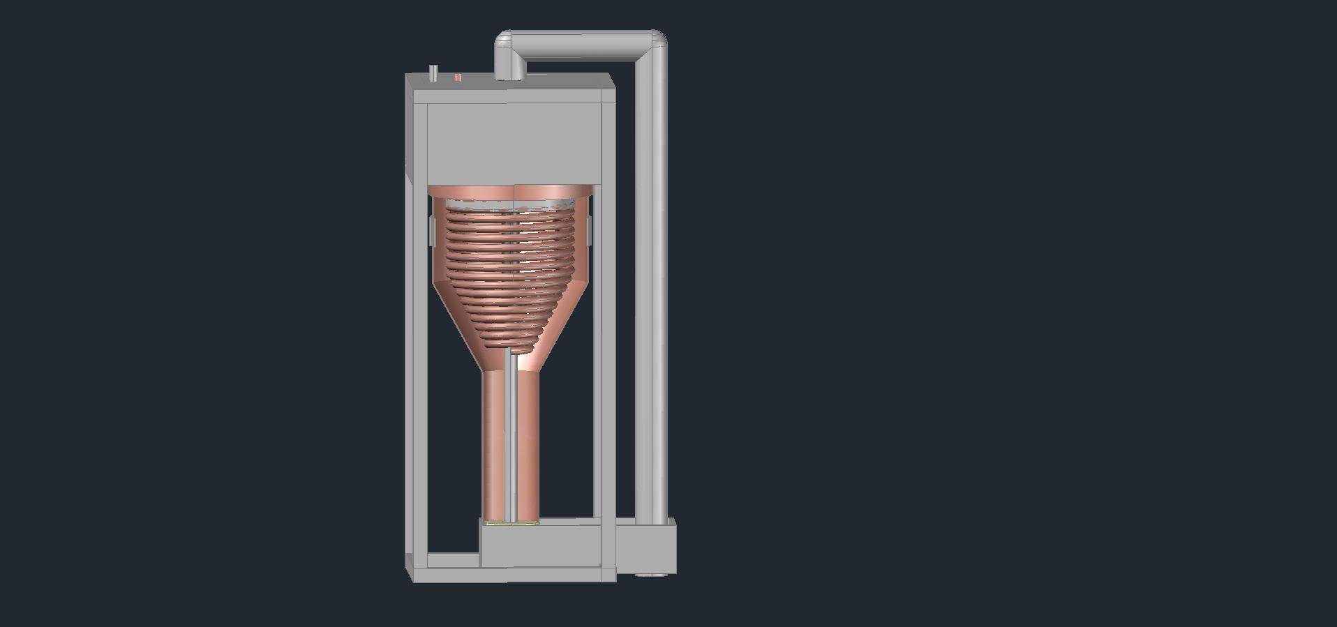 2) COPPER BOWL, 22″ HIGH, 191/4″ O.D., 1/8″ THICK, CONE SHAPED TO 4-3/4″ O.D. This bowl is fastened at its top flange directly to the aluminum frame part #1 by use of non-magnetic bolts, (bolts that a magnet will not adhere to).